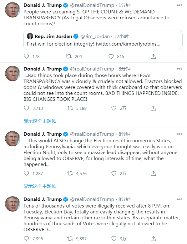 特朗普还转发美国共和党众议员Jim Jordan的推文并称:“人们现在尖叫着要停止计票,我们要求透明(因为法律观察员被拒绝进入计票室)!”