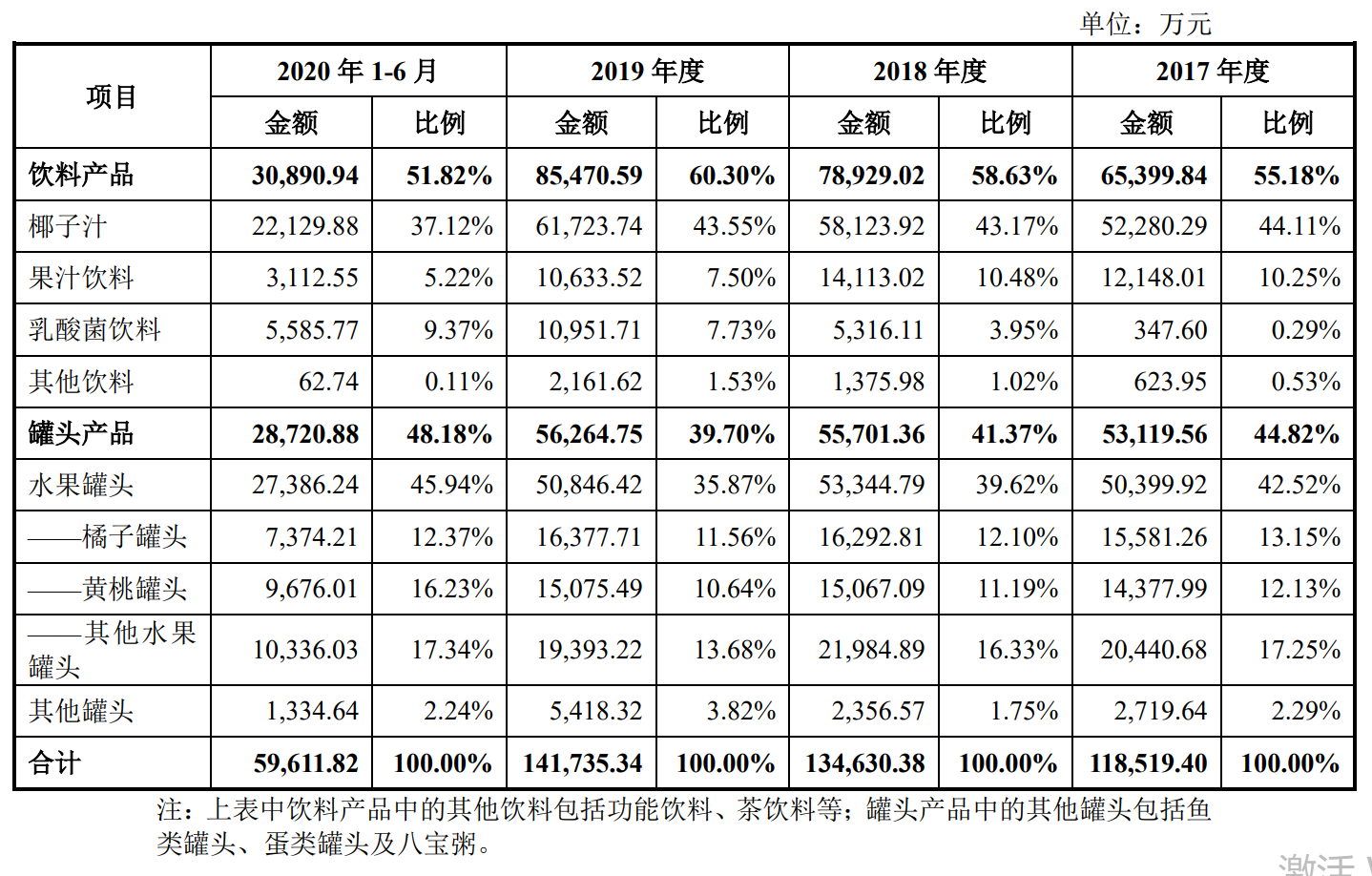 公司产品主要分为两大类:第一类是椰子汁植物蛋白饮料、果汁饮料、乳酸菌饮料等饮料产品;第二类是水果罐头、八宝粥罐头等罐头食品。