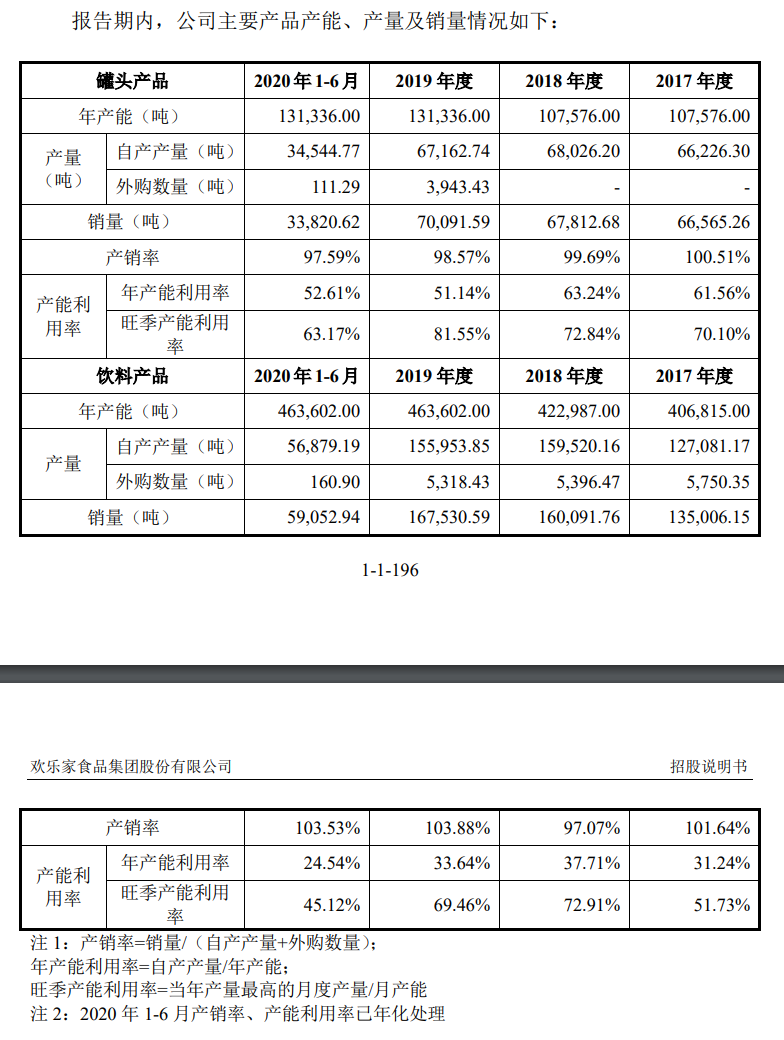 不过欢乐家说明书显示,其罐头产品生产线2020年上半年的年产能利用率为52.61%,2019年时年产能利用率为51.14%,即便是旺季产能利用率,两个数字分别为63.17%和81.55%,也都没有达到满负荷操作。从不到100%的产销率来看,其销量并不能撑满整个产能。2019年罐头产品的自产产量为6.72吨,年产能为13.13万吨。