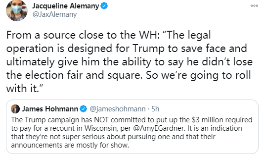 《华盛顿邮报》记者Jacqueline Alemany援引白宫消息人士说法称:“法律操作是为了让特朗普挽回面子,最终让他可以声称自己在不公正的情况下输掉选举。那我们跟着走就好了。”