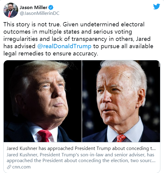 对此,米勒于当地时间周日(8日)在推特上写道:“考虑到多个州的选举结果尚未确定,还有一些州存在严重的投票违规行为,以及部分州的投票过程缺乏透明度,库什纳建议特朗普总统通过一切可行的法律手段来确保(计票)准确性。”