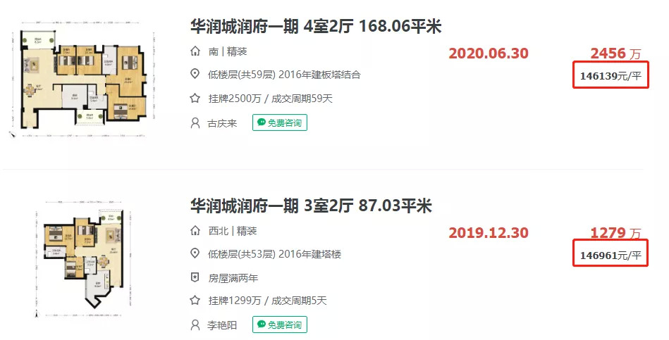 目前,据链家信息,华润城一到三期的参考均价在16.9-18.2万元/平方米区间。但平台上公开的信息中,只有14万元/平方米左右的成交记录。