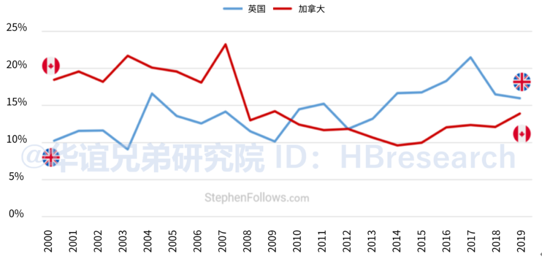 英国则日益成为主要的电影拍摄地,长期以来,由于拥有专业的技术人才、多样化的设施、便利的时差以及相似的语言,英国一直受到美国制片方的青睐。随之而来的,伴随英国地位的不断提升,加拿大黯然退场。下面这组数据,就显示了英国和加拿大的地位此消彼长的互换情况。
