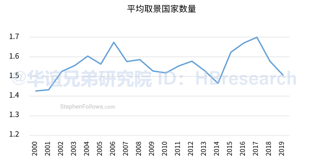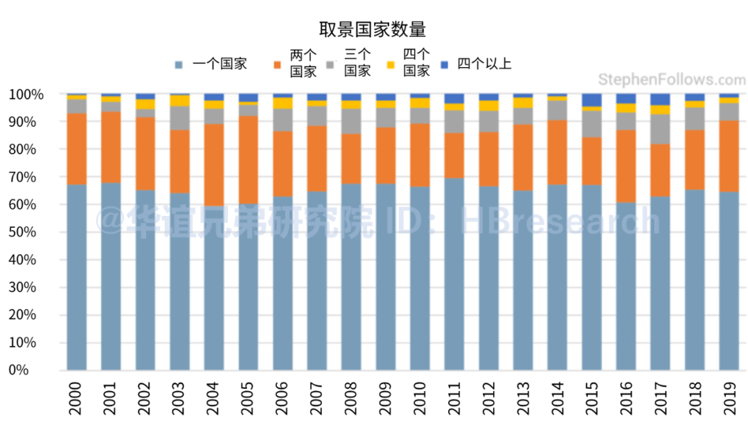 数据显示,在2000年至2019年间,排名前200的电影平均取景国家数量为1.6个。接近70%的电影仅在一个国家拍摄取景,23%的电影会进行一次跨国取景,而其他12%的电影取景则跨域两个甚至更多的国家。