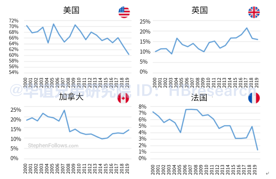 数据显示,在2000年至2019年间,美国本土以接近70%的比例遥遥领先,不过,我们也应当看到,由于其他国家提供的退税政策等原因,近几年美国作为电影拍摄地的受欢迎程度一直在下降,事实上,美国并不是个例,法国的地位在过去几十年里也经历了大幅下滑的情况。