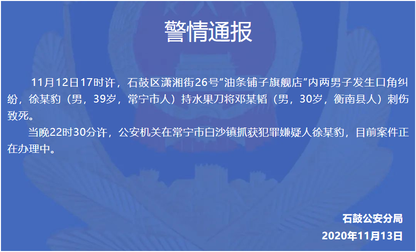 据湖南省衡阳市公安局石鼓分局微信公众号通报,11月12日17时许,石鼓区潇湘街26号“油条铺子旗舰店”内两男子发生口角纠纷,徐某豹(男,39岁,常宁市人)持水果刀将邓某韬(男,30岁,衡南县人)刺伤致死。当晚22时30分许,公安机关在常宁市白沙镇抓获犯罪嫌疑人徐某豹,目前案件正在办理中。