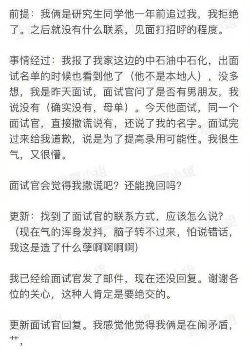 最近,网络上有女生发帖爆出,在面试某企业时,同组竞争的男生为了提高录用可能性,将该女生编造成其女朋友。