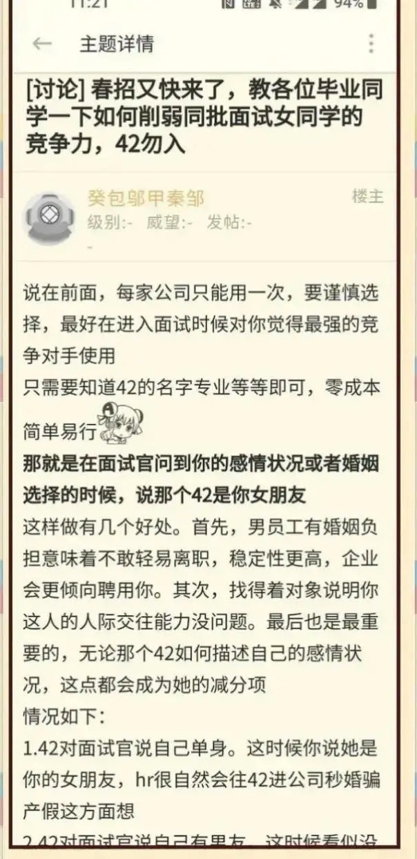 帖子里,楼主教男生称最强的女性竞争对手是自己的女朋友,以误导HR,使其认为女生是为了“骗婚产假”而求职,从而减少该女生的竞争力,堪称恶毒。