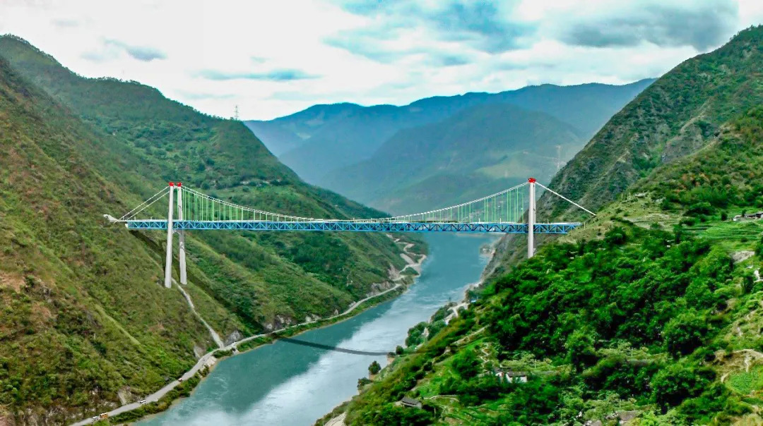 丽香铁路金沙江特大桥为三跨连续单跨悬吊上承式钢桁梁悬索桥,是国内首座大跨径铁路专用悬索桥,全桥长882.5米,主跨达660米,跨越金沙江。