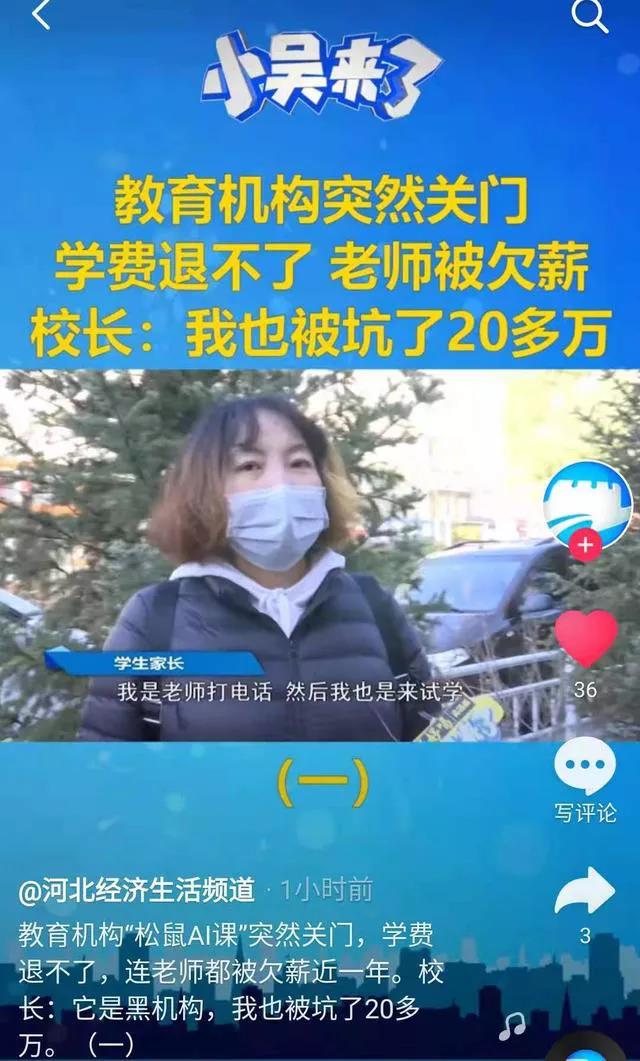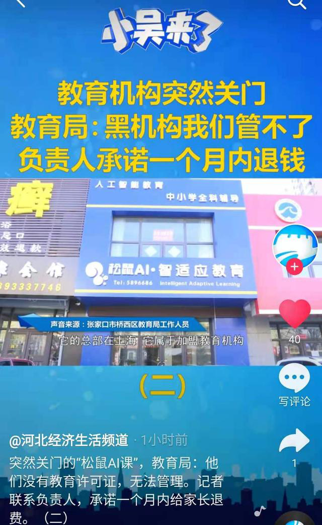 近日,据河北经济生活频道消息,松鼠AI课张家口市19中校区突然跑路关门,家长退费无门,甚至老师薪资已经拖欠10个月。消息报道后,松鼠AI总部回应称,该学校是合作关系,已经和所有家长对接处理费用,不会出现问题,松鼠AI会对家长100%负责。