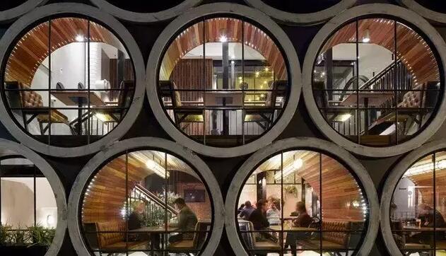 先从外观来看,大脑洞的设计师把这个哆啦A梦动画片中,大雄经常躲在里面“哭鼻子”的水泥管道搬了过来,直通街外的设计不仅使其正面望去感觉空间拓宽不少,更是以17个巨大的混凝土管道作为就餐区亮点,成功吊起了年轻人的猎奇心。