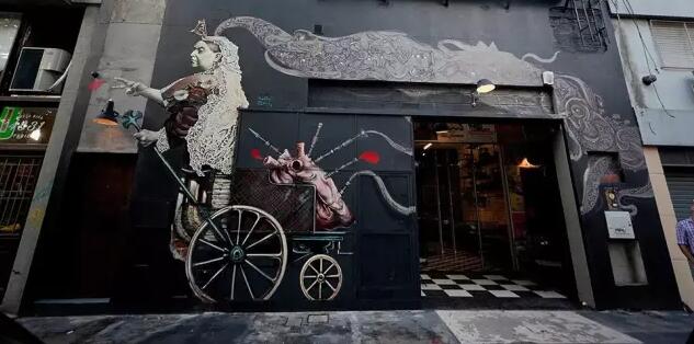 门口没有任何Logo和广告标语,留下的只有三层楼高的黑色墙面和神秘壁画。