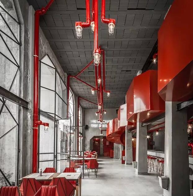 室内以黑白红三色为主,还有大面积裸露的红色管道和冷灰色的水泥。