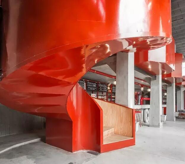 Captain Central Brewery酒吧不仅在颜色上注重反差效果,且仔细观察后你还会发现,空间内部的柱子和楼梯的宽度面积都很大,而这与它的椅子腿和玻璃上铁质装饰的细致简直形成了两个极端。