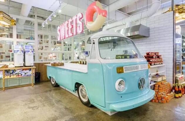 设计的“高潮”就属这台天蓝色的老式大众车T1了,它被摆放在一进门最显眼的位置,且被改装成了柜台,上面总会布满各种各样的甜品和甜甜圈。颇具童话感的大众车,趣味十足的装饰物,温暖的色彩,这些元素在被安置到一个空间并加以分割和平衡之后,为顾客打造出的是十分愉悦的用餐体验。
