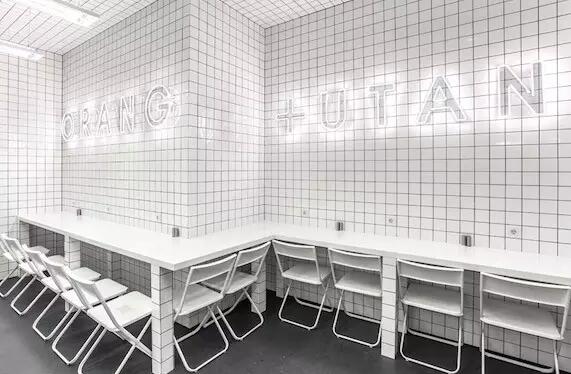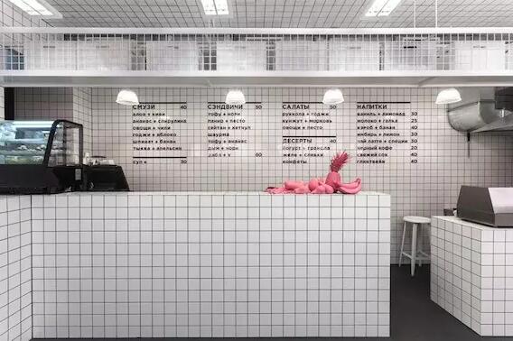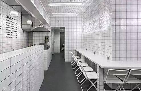 整个餐厅内最多的元素就是这个,小时候经常会在洗手池中见到的小白瓷砖,这还不够,室内的桌椅、Logo、灯光、洗手池,无一不是白色……