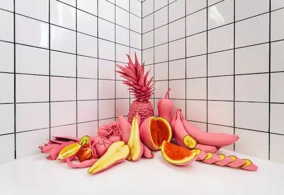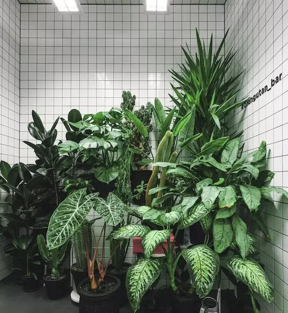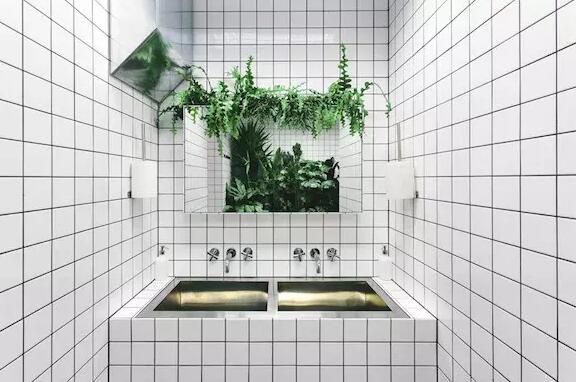 如果你感觉到很紧张,或者越来越饿,你可以抬头看看吧台上这个骚粉色的水果摆设,不过我估计让你最能为之眼前一亮的,应该是厕所这片颜色对比异常强烈的绿色植物了。