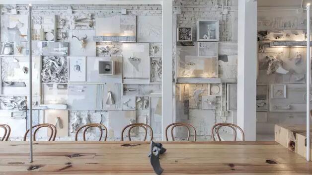只有70平米的Hueso餐厅里面,有着大约10000件品类繁多的动物骨头(不重样),设计师以不同造型和不同质地的骨头本身,来增加墙面的立体感和肌理感,这其中还有各种附着的样式,比如将它们陈列在墙上的壁龛之中,或者放到画框里,再或者直接将骨头悬挂到天花板上。