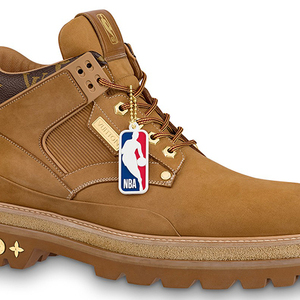 该系列包括一款户外及踝靴Oberkampf,分别有姜黄和黑两种配色。NBA的元素出现在鞋舌和吊牌上,鞋后跟上部则印有LV的经典老花,鞋底的边缘处镶嵌了象征LV元素的金属装饰。