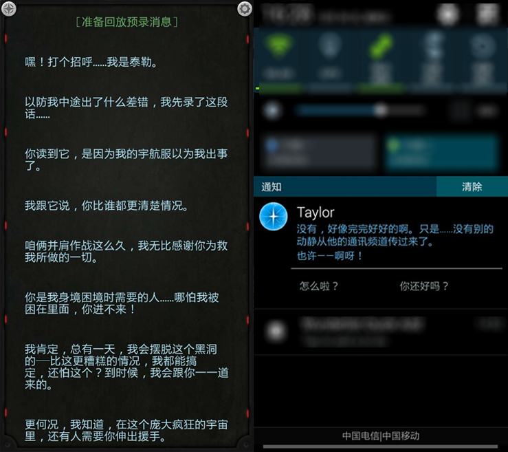 从本质上来说,《生命线》是一部优秀的“互动科幻小说”,你的不同选择将导致故事的不同剧情走向。但游戏添加了“等待时间”和“通知栏选项”两处设计,这让初次通关的体验堪称惊艳。你会觉得自己和游戏角色的时间是同步流逝的,你的等待也变成了游戏的一部分。这也是一款可以在通知栏里运行的游戏,你甚至可以把它看作是某种通讯软件,上面只有一个联系人。他身处太空危机之中,时不时会给你发信息,偶尔絮叨偶尔忙碌。更重要的是,他会采纳你给出的每个建议,他的命掌握在你手上。