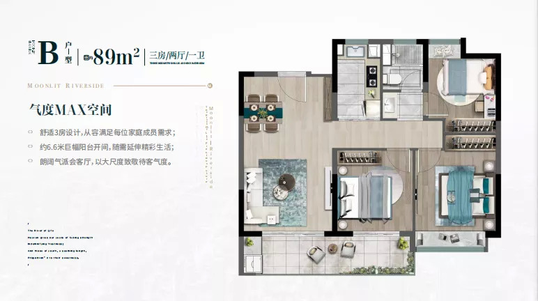 户型建筑面积约89㎡ B户型:三房两厅一卫,三开间朝南,6.6米阳台开间,南北双卧都带飘窗。