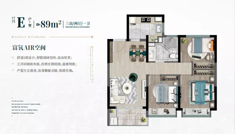 户型建筑面积约89㎡ E户型:三房两厅一卫,户型方正通透,三开间朝南,明厨明卫。