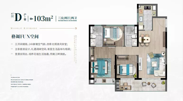 户型建筑面积约103㎡ D户型:三房两厅两卫,三开间朝南主卧套间设计,私密性好。,双阳台,室内采光充足。