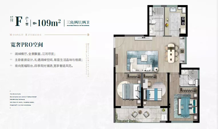 户型建筑面积约109㎡ B户型:三房两厅两卫,阔绰横厅设计,三间卧室全部朝南,南向宽幅阳台,全景飘窗,室内采光充足。