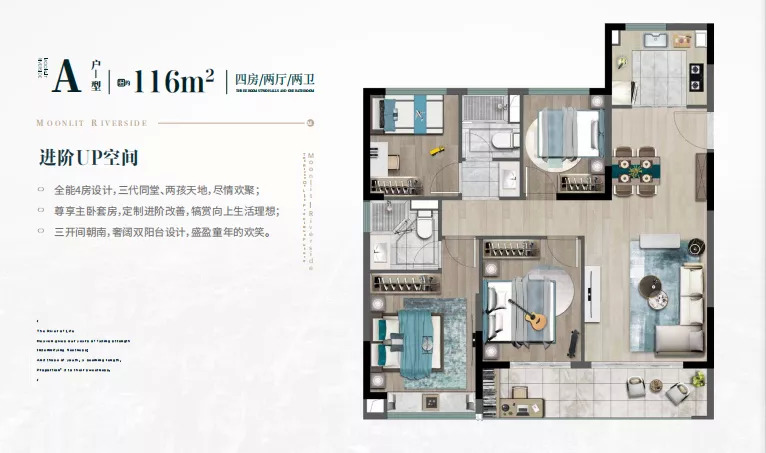 户型建筑面积约116㎡ A户型:三房两厅两卫,三开间朝南,全南向双跨宽境阳台,户型方正,南北通透。