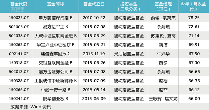上月收益后十的基金中,申万菱信深成指B(150023)大跌78.2%,亏损最为严重。另外,跟踪军工、互联网金融、医疗、证券、新能源、一带一路、创业板等指数的分级基金B份额依次上榜,亏损全部在六成以上。