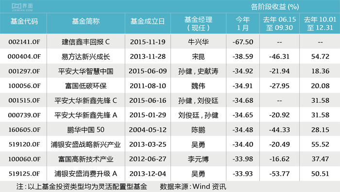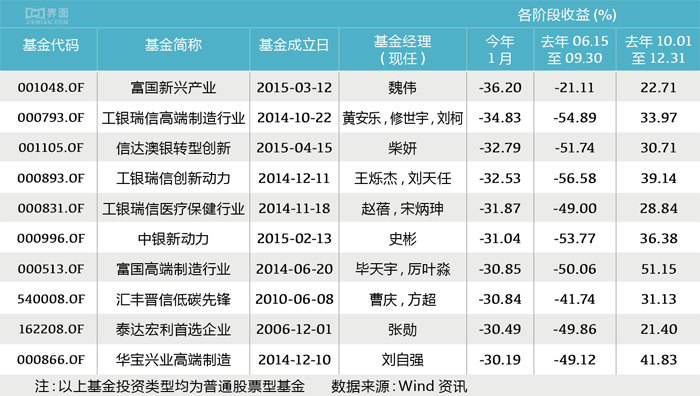 除上述杠杆类产品和“特殊事件”引发暴跌的基金外,今年以来亏损深重的基金中,有很多是去年年末业绩耀眼的“明星基金”。下面分别为混合型基金和股票型基金1月收益后十名名单。