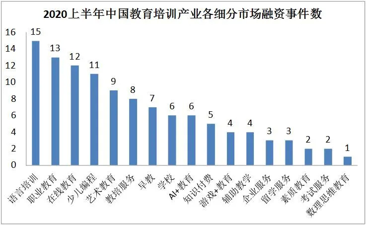 对比学研智库8月份《 2020上半年中国教育培训产业投融资报告》发现,在该报告中,语言培训类创业项目以15例投融资事件位居所有细分赛道首位。在融资额度方面,15个语言培训类项目以21.48亿元人民币总融资额仅次于被投融资热捧的在线教育领域。