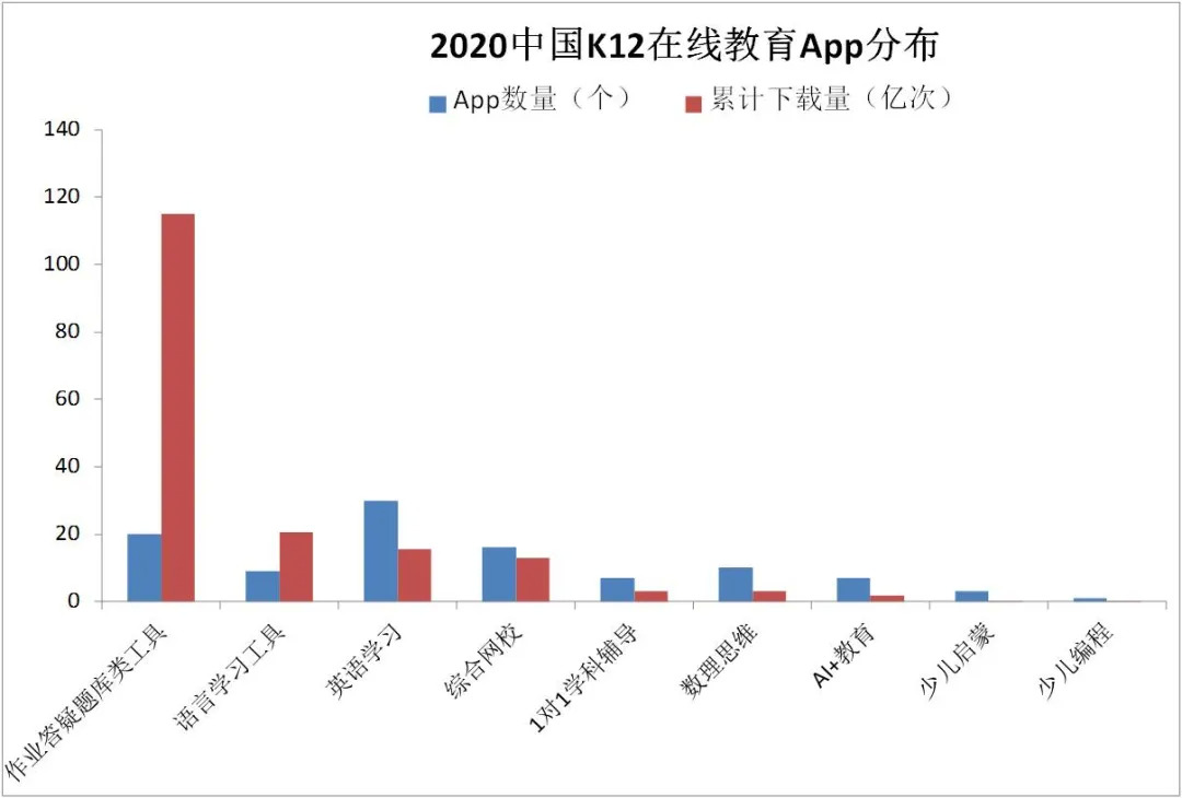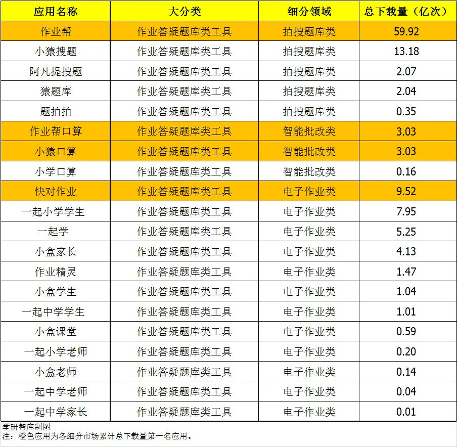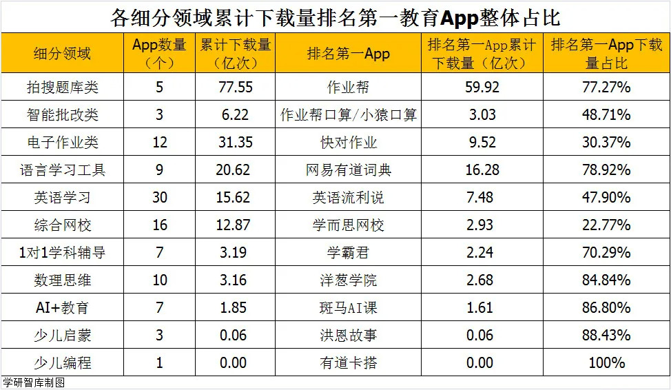 - 作业答疑题库类工具App累计下载量最大(115.12亿次),英语学习类App数量最多(30款);