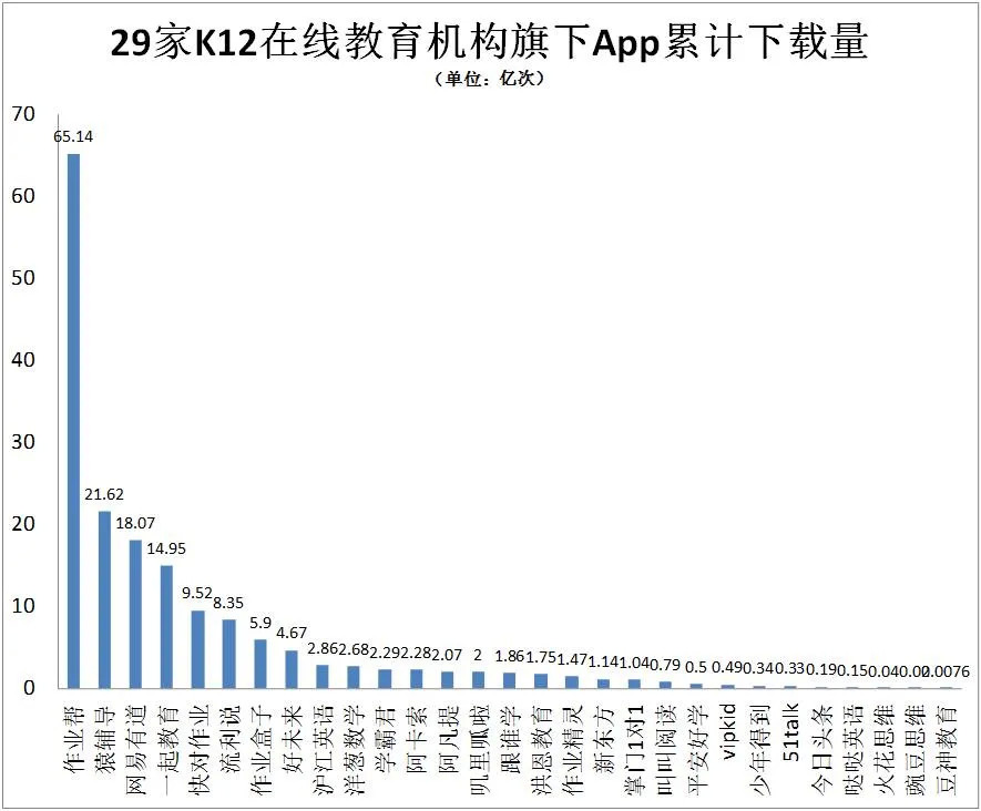 - 截止2020年10月15日,29家中国k12在线教育机构的103款App,在国内7大安卓应用平台累计总下载人次为172.5亿次;
