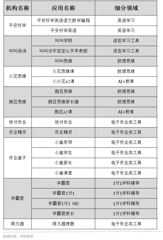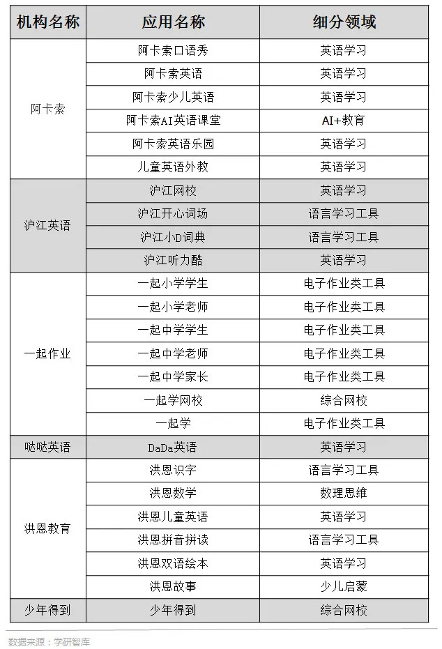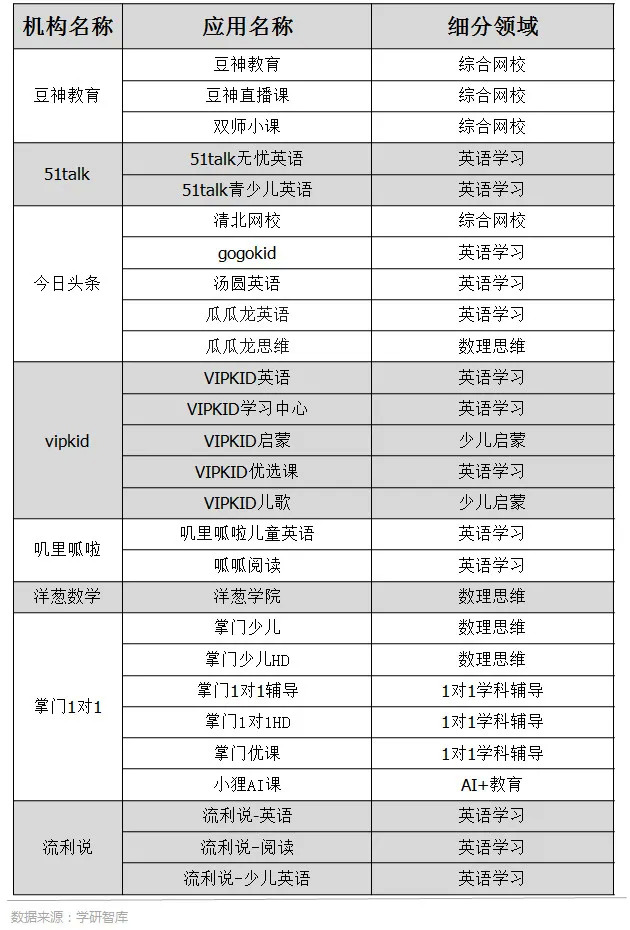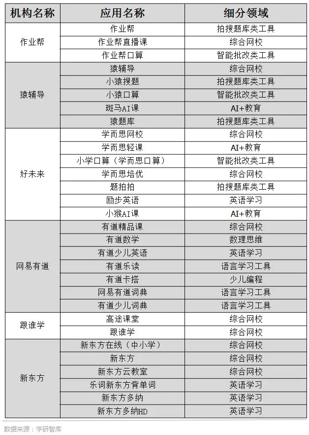29家机构完全名单(排名不分先后):作业帮、猿辅导、网易有道、一起教育、快对作业、流利说、作业盒子、好未来、沪江英语、洋葱数学、学霸君、阿卡索、阿凡提、叽里呱啦、跟谁学、洪恩教育、作业精灵、新东方、掌门1对1、叫叫阅读、平安好学、vipkid、少年得到、51talk、今日头条、哒哒英语、火花思维、豌豆思维、豆神教育。(103款应用详见本报告最后一部分。)