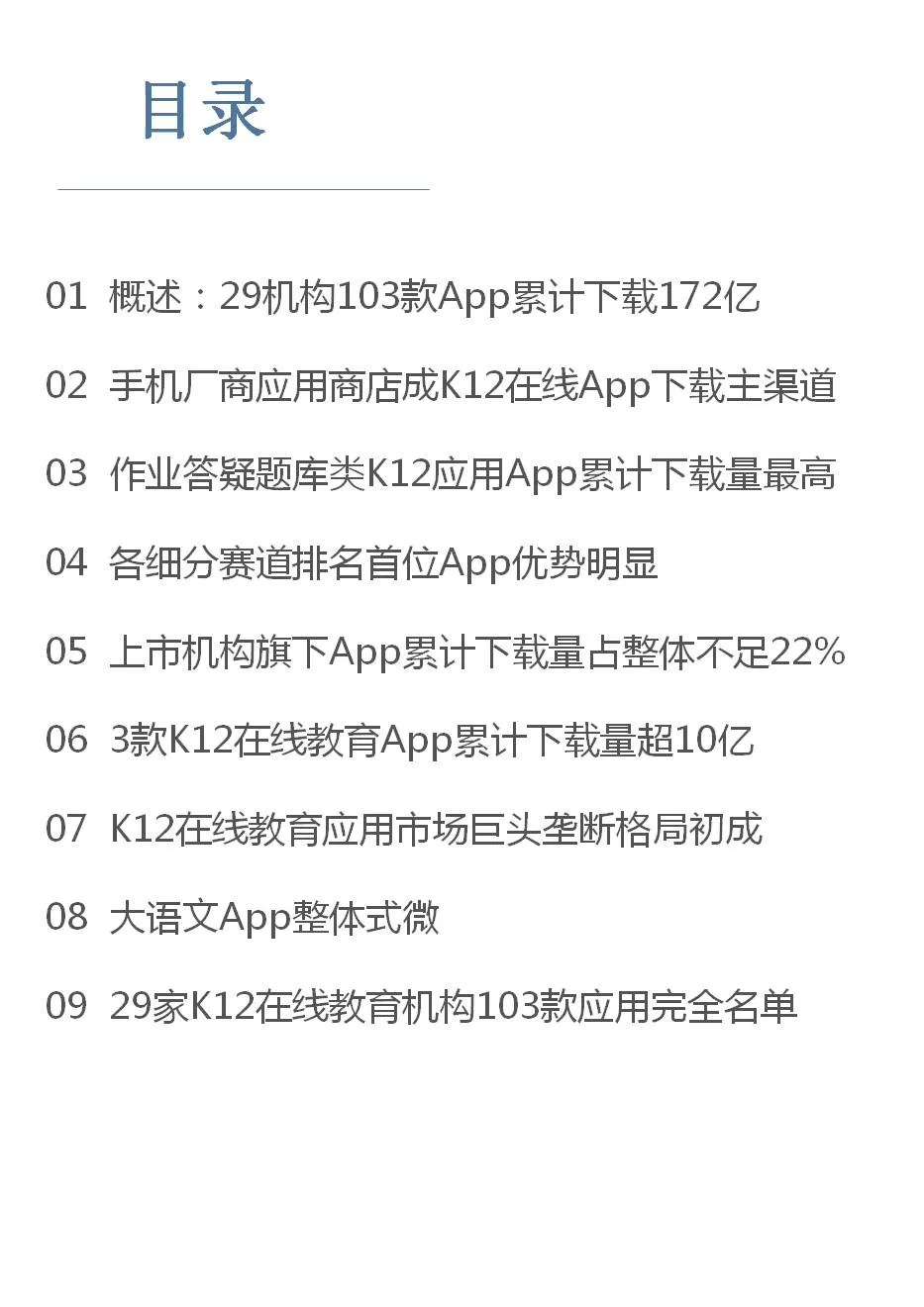本报告所指K12在线教育应用,是指面向从幼儿园到高中阶段3-18岁幼儿园、小学、中学,以启蒙、语言学习、作业辅助、提分为主要目的移动应用产品。本报告“下载量”指某款应用在应用分发平台自应用上传后累计下载量,包括使用这些应用硬件终端下载及其后的应用更新下载。