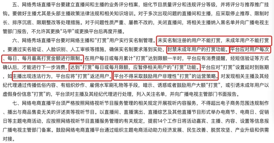 其中通知第6条中,对网络直播打赏行为提出了明确监管要求。如实行用户实名注册,封禁未成年人用户的打赏功能;平台应对用户每次、每日、每月最高打赏金额进行限制,如超出限额,应暂停用户“打赏”功能;对“打赏”设置延时到账期,如主播出现违法行为,平台应将“打赏”返还用户;对暗示、诱惑或者鼓励用户大额“打赏”或者引诱未成年人“打赏”的,应从严处理。