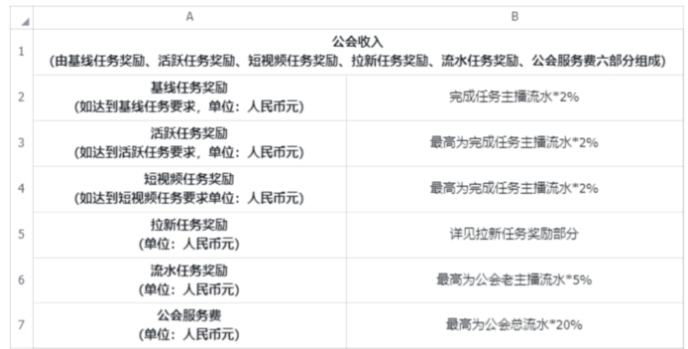 《抖音直播11.1-11.30公会月任务说明》(以下简称《说明》)明确指出,每个公会的月任务由基线任务奖励、活跃任务奖励、短视频任务奖励、拉新任务奖励、流水任务奖励、公会服务费六部分组成。