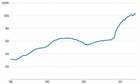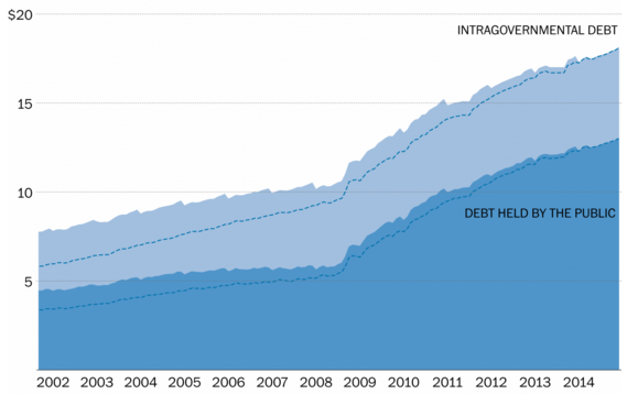 截至2016年1月末,美国政府债务规模突破了19万亿美元,债务占GDP比率正迫近105%。