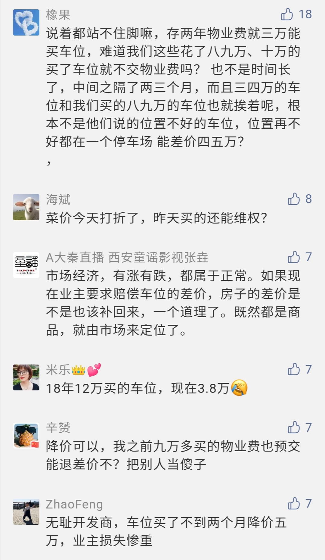 后续网名“橡果”业主给界面楼市西安频道相关平台留言称:“三四万的车位和我们买的八九万的车位也就挨着呢,根本不是他们说的位置不好的车位……。”网名“米乐”的业主也留言称:“18年12万买的车位,现在3.8万。”