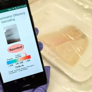 而在电子鼻的条形码中,有20个条码,条码是由一种装载了不同类型燃料的纤维素壳聚糖制成的,这些燃料会跟肉类释放的气体发生反应,并根据不同类型和浓度的气体而改变颜色,从而形成独特的颜色组合,相当于一种肉类状态的独特的“气味指纹”。