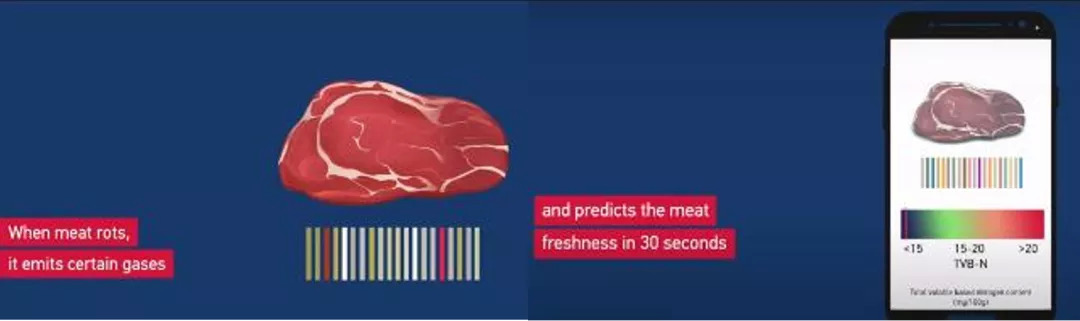 通常来说,我们都是靠着个人经验和自己的嗅觉能力来判断这些食物的新鲜程度,但显然食物零售商们做不到雇人随时检测变化来评估食物的使用周期,消费者做不到对冰箱里的生鲜食物做到准确判断。