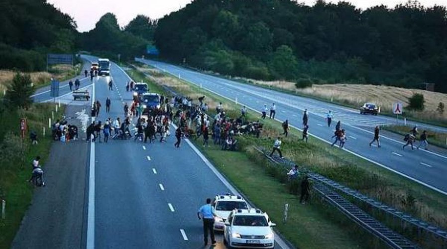 (中东难民沿高速公路途径德国丹麦步行去瑞典)