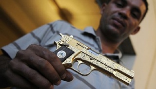 艾比比认为这把枪可能是卡扎菲某个儿子在革命32周年庆典上送给他的礼物。那次革命把卡扎菲推上了统治者的宝座;几乎正好是十年之后,艾比比手持金枪欢呼的照片见证了卡扎菲时代的终结。