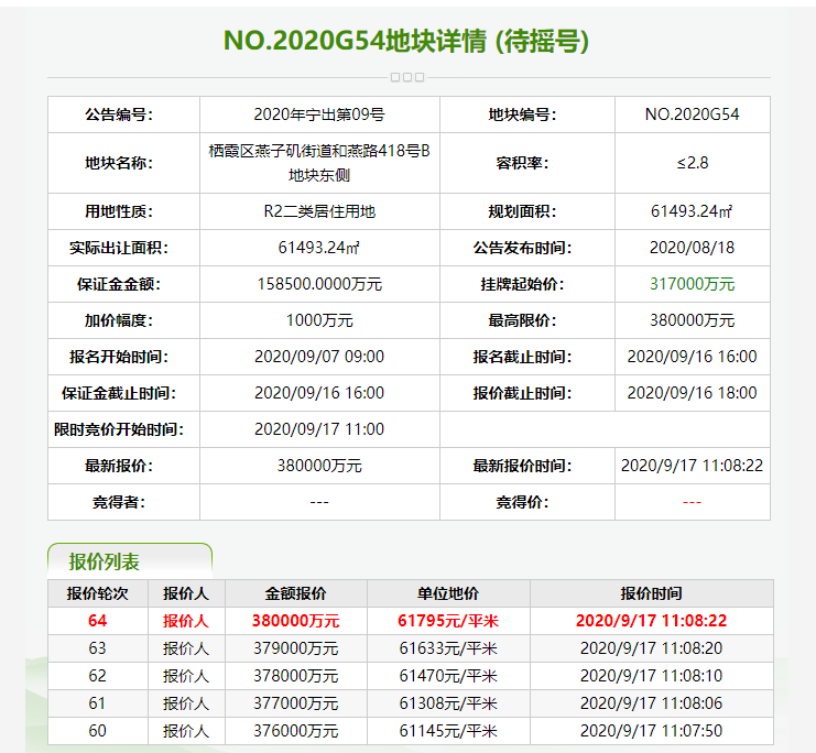 2020年9月17日,经过64轮报价,燕子矶G54地块触顶最高限价,最终被万科以总价38.1亿,成交楼面价22128元/㎡,毛坯限价32000元/㎡收入囊中!