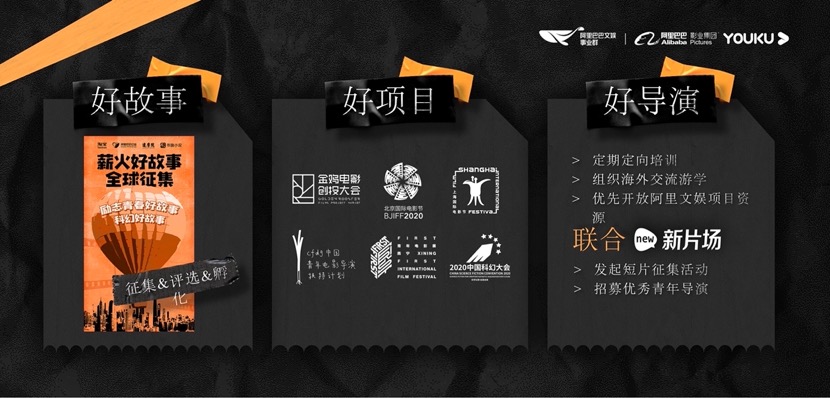 阿里文娱“薪火计划”负责人李静平表示,“好故事、好项目、好导演”是该计划未来的工作重点,未来将联合淘宝“故事商店”、阿里公益“励志青春”故事征集活动,挖掘奋斗故事,并发起“科学幻想”故事征集,“发现属于中国的科幻故事”。未来,还将提供给青年导演海外交流学习的机会,并与新片场进行命题短片征集,发现更多人才。