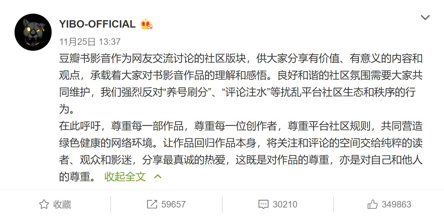 鉴于此,不少新上榜的书目和长居榜首的经典名著都受到了饭圈的入侵。许多图书编辑陆续表示,养号现象并不是近期才出现的,这些账号大量复制粘贴高赞短评,毫无根据地打分,不仅影响了读者对图书的判断,也是对作品本身的不尊重。11月24日,接到投诉的“豆瓣读书”做出回应,表示将对异常用户进行处理,并将进一步推进豆瓣反水军机制。随后,王一博官方宣传账号也发布微博称“强烈反对‘养号刷分’、‘评论注水’等扰乱平台社区生态和秩序的行为。”