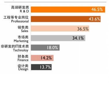 此外,在岗位方面,企业对于高端研发类岗位的招聘量最大,占比达46.5%。排在第二、三位的分别为工程等招聘岗位、销售类。