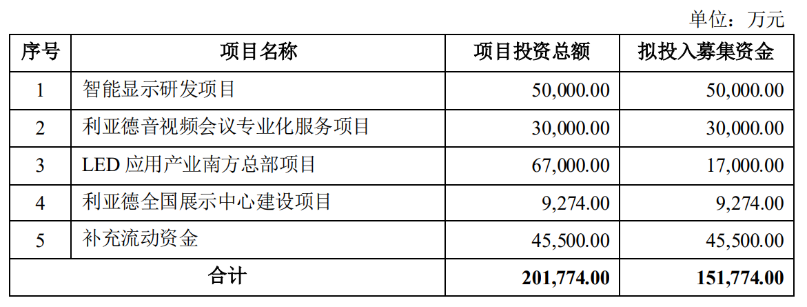 利亚德(300296.SZ)12月3日晚间称,公司计划向特定对象发行不超过4亿股(含),募资不超过15.1774亿元,投入“智能显示研发项目”、“利亚德音视频会议专业化服务项目”、“LED应用产业南方总部项目”、“利亚德全国展示中心建设项目”、“补充流动资金”,分别拟投入金额为5亿元、3亿元、1.7亿元、9274万元、4.55亿元。相关方案需在12月21日的股东大会上投票。