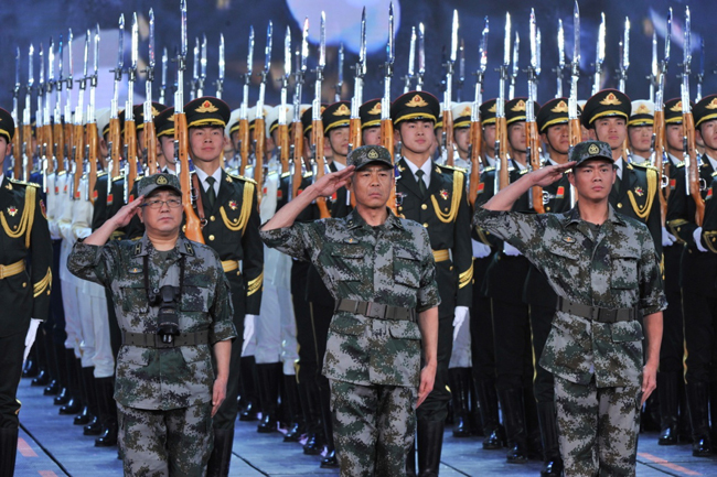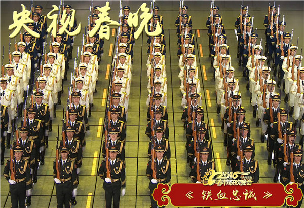22. 小品之后是海陆空三军仪仗队100名官兵出场,表演《铁血忠诚》。